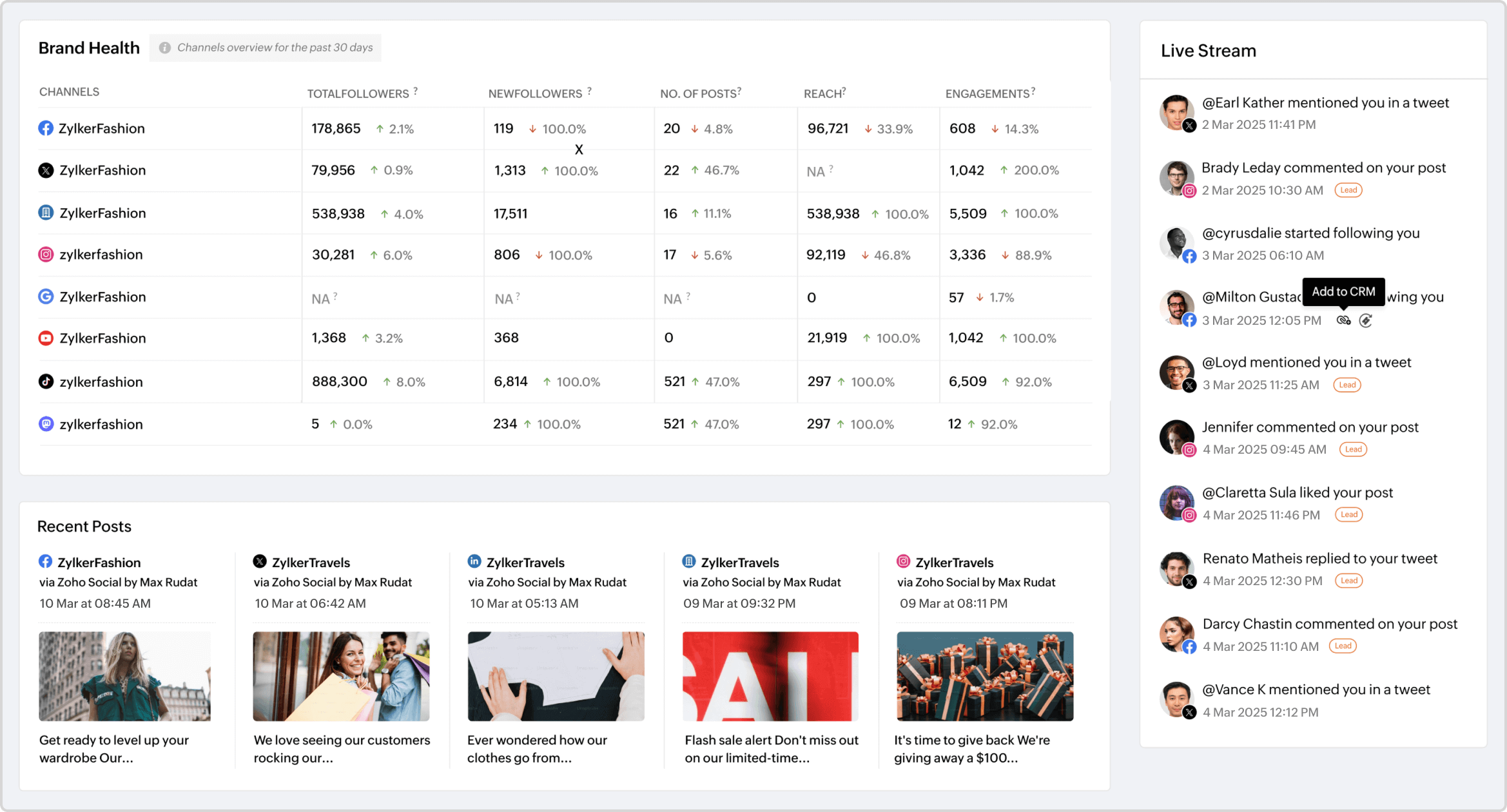 Having your inboxes open for customer queries on social media is the key to building strong customer relationships. When customers have a query about a product in your store, the easiest window is social media; but keeping track of all channels can get tough. With Zoho Social's unified inbox, you can view all essential engagements, such as comments and messages, assign them to your team,and also set priority levels. The conversation history helps you know the customer better, and you or your team can have more potential conversations.